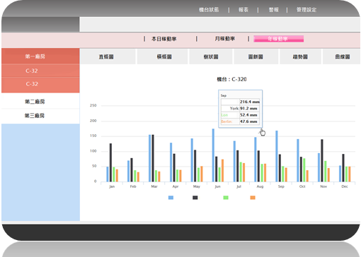遠程監控、稼動率統計、故障統計分析、售後服務之整合,計算流線生產線之稼動時間分析與智能工單排程系統,並從管理階層及產線進行改善。